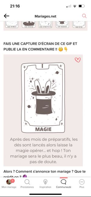 Coucou tout le monde 💜 Merci d'avoir participé jusqu'au bout ! Maintenant qu'on en sait un peu plus sur ton mariage, on va pouvoir tirer les cartes... FAIS UNE CAPTURE D'ÉCRAN DE CE GIF ET PUBLIE LA EN COMMENTAIRE !! 🧐👇 Alors ? Comment s'annonce ton...