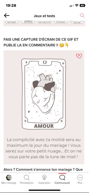 Coucou tout le monde 💜 Merci d'avoir participé jusqu'au bout ! Maintenant qu'on en sait un peu plus sur ton mariage, on va pouvoir tirer les cartes... FAIS UNE CAPTURE D'ÉCRAN DE CE GIF ET PUBLIE LA EN COMMENTAIRE !! 🧐👇 Alors ? Comment s'annonce ton...