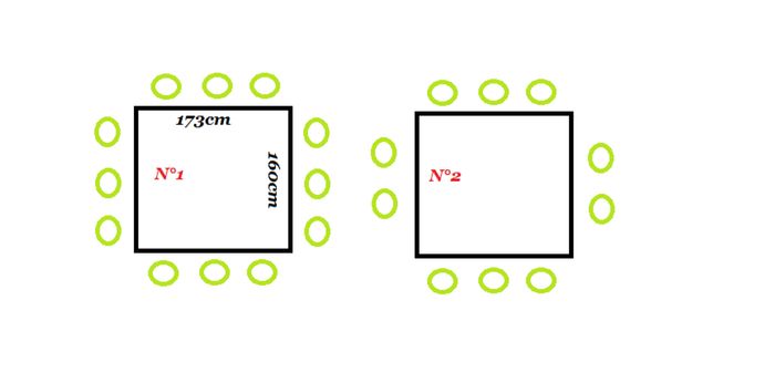 Bonjour, Je ne sais pas combien de personnes mettre par table :/ Mes tables feront 173x160cm, je veux pas que les invités soient trop serrés notamment ceux qui sont sur les bords... Donc j'hésite entre deux : j'ai peur que sur la n°1 les personnes...