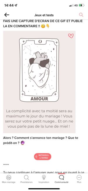 Coucou tout le monde 💜 Merci d'avoir participé jusqu'au bout ! Maintenant qu'on en sait un peu plus sur ton mariage, on va pouvoir tirer les cartes... FAIS UNE CAPTURE D'ÉCRAN DE CE GIF ET PUBLIE LA EN COMMENTAIRE !! 🧐👇 Alors ? Comment s'annonce ton...