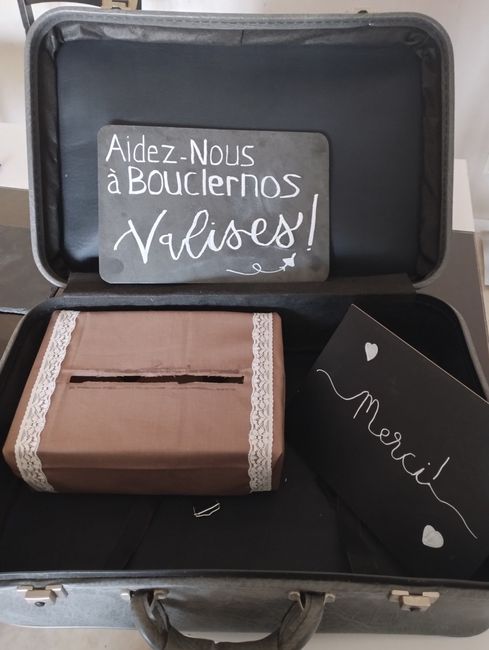Bonjour. Voici en photo le début de la déco coin urne. Customisation et écriture maison (je me suis appliquée, je suis gauchère) Décoration qui m'aura coûté en tout : 9€98 (valise, ardoises, urne et feutre) Valise acheté d'occasion 3€, urne cagette...