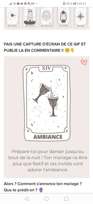 Coucou tout le monde 💜 Merci d'avoir participé jusqu'au bout ! Maintenant qu'on en sait un peu plus sur ton mariage, on va pouvoir tirer les cartes... FAIS UNE CAPTURE D'ÉCRAN DE CE GIF ET PUBLIE LA EN COMMENTAIRE !! 🧐👇 Alors ? Comment s'annonce ton...
