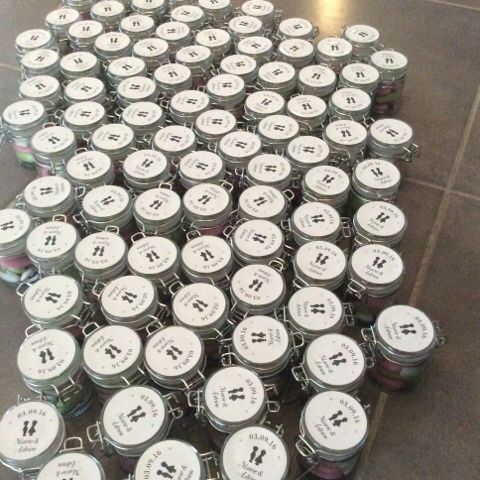 Bonjour à toutes! Je viens de terminer les dragées pour le jour j! Dans chaque contenant, j'ai mis : 4 dragées rose au chocolat noir, 3 dragées vert au caramel beurre salé et 6 petits coeurs blanc au chocolat au lait ( on est pas fan des...