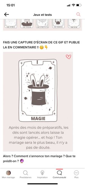 Coucou tout le monde 💜 Merci d'avoir participé jusqu'au bout ! Maintenant qu'on en sait un peu plus sur ton mariage, on va pouvoir tirer les cartes... FAIS UNE CAPTURE D'ÉCRAN DE CE GIF ET PUBLIE LA EN COMMENTAIRE !! 🧐👇 Alors ? Comment s'annonce ton...