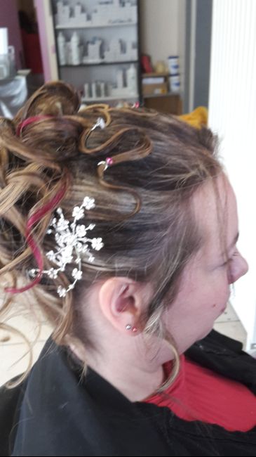 Voilà mon essai coiffure Avec une mèche fushia pour rappeler mon thème et mon bouquets