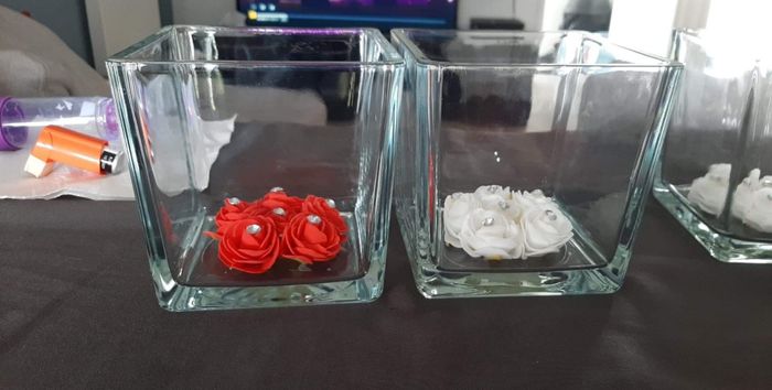Bonjour à toutes après avoir changer je ne sais combien de fois d avis voici mon dernier essai de table Dans les grand verres sa sera des vrais fleurs rose rouge et sur la bouteille argent la décoration n est pas coller en bas car il manque de la...