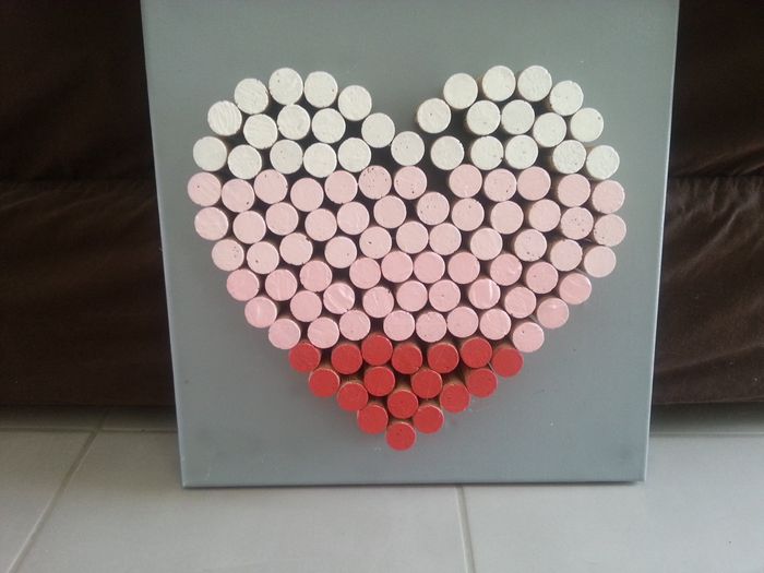 Bonsoir, Voici une partie de notre déco, les tableaux en bouchons. Nos couleurs sont le rose et gris. Il me semble qu'il y a un tuto sur le site. on est super content du rendu