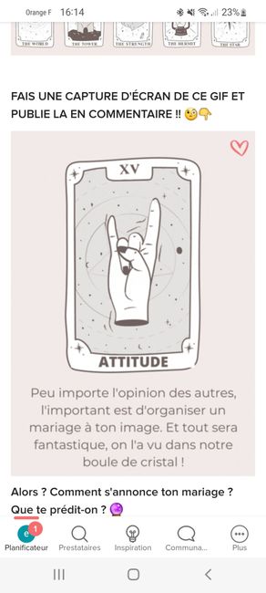 Coucou tout le monde 💜 Merci d'avoir participé jusqu'au bout ! Maintenant qu'on en sait un peu plus sur ton mariage, on va pouvoir tirer les cartes... FAIS UNE CAPTURE D'ÉCRAN DE CE GIF ET PUBLIE LA EN COMMENTAIRE !! 🧐👇 Alors ? Comment s'annonce ton...