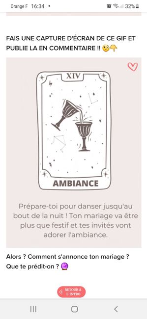 Coucou tout le monde 💜 Merci d'avoir participé jusqu'au bout ! Maintenant qu'on en sait un peu plus sur ton mariage, on va pouvoir tirer les cartes... FAIS UNE CAPTURE D'ÉCRAN DE CE GIF ET PUBLIE LA EN COMMENTAIRE !! 🧐👇 Alors ? Comment s'annonce ton...
