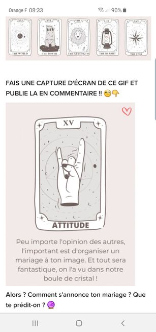 Coucou tout le monde 💜 Merci d'avoir participé jusqu'au bout ! Maintenant qu'on en sait un peu plus sur ton mariage, on va pouvoir tirer les cartes... FAIS UNE CAPTURE D'ÉCRAN DE CE GIF ET PUBLIE LA EN COMMENTAIRE !! 🧐👇 Alors ? Comment s'annonce ton...