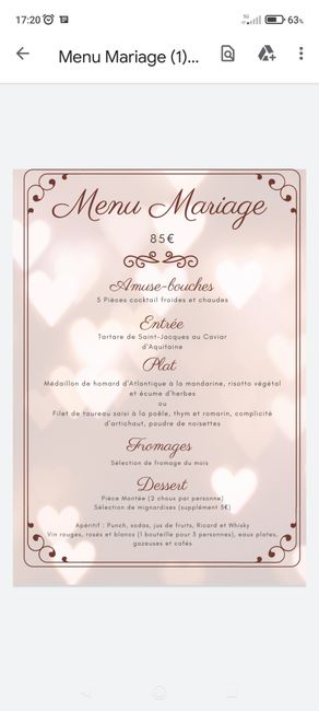Bonjour voici le menu de notre mariage du 1 juillet 2023 La prestataire qui nous fait un tarif pour la pièce montée de macaron (par la dame qui travaille avec eux c'est 160 € en plus) pour 2 macaron personnalités on est 65 personnes Es ce que cher ou...