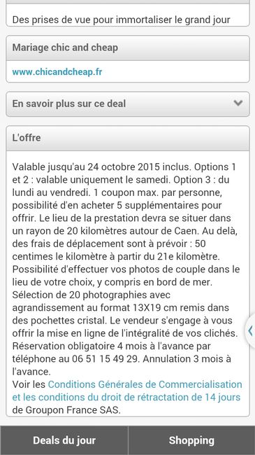 Bonjour je viens de tomber sur une offre qui à l air bien sympatique pour les futurs marié(e)s du calvados. Photographe de Caen. 199e au lieu de 390e. Avec 20 clichés imprimés et toute les photos sur leur site. Déplacement gratuit jusqu'a 20km autour...