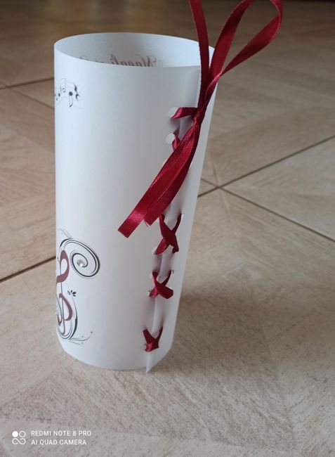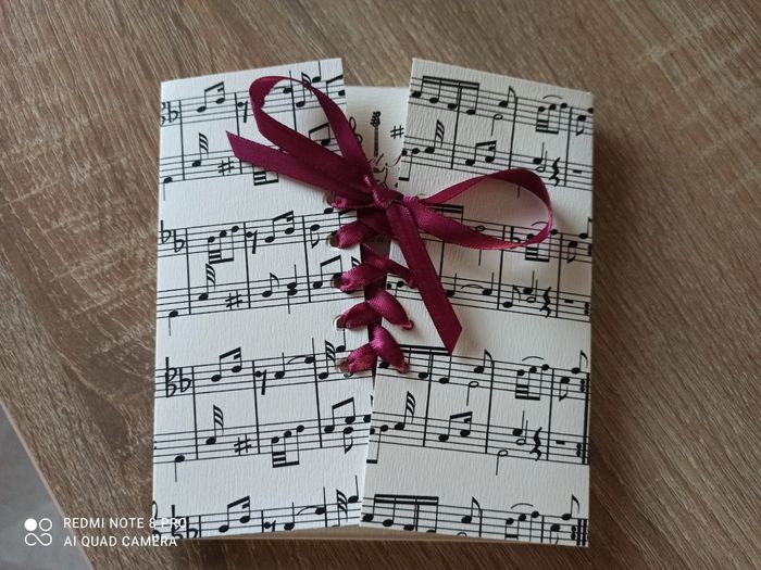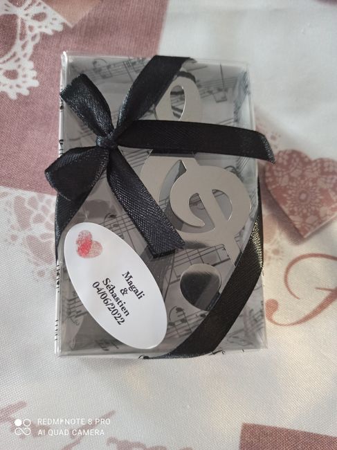 Coucou. Quelques photos de mes essayages pour la table des mariés et tables des invités et boîtes chocolat et nougats individuel et cadeau c'est un marque page en forme de clef de sol. Également table pour le livre d'or. J'attends la livraison du...