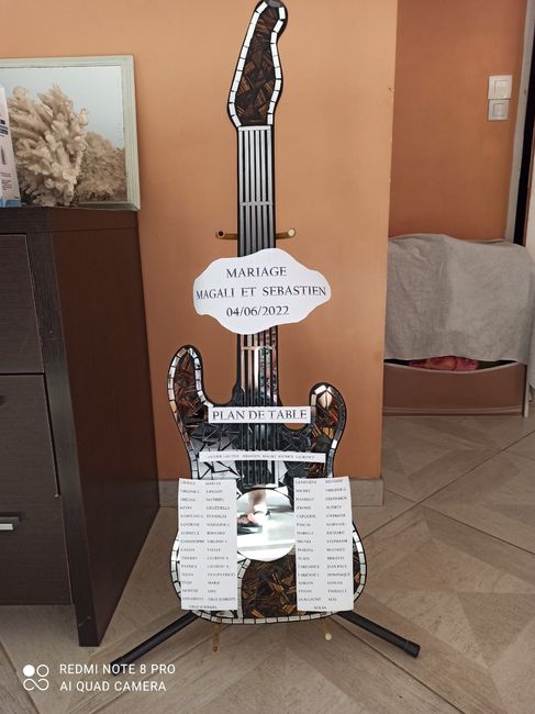 Qu'en pensez vous ? A amélioré un peu peut être. Mais j'adore mon idée. Guitare en mosaïque avec le plan de table dessus. Thème musique bien sûr. Lol