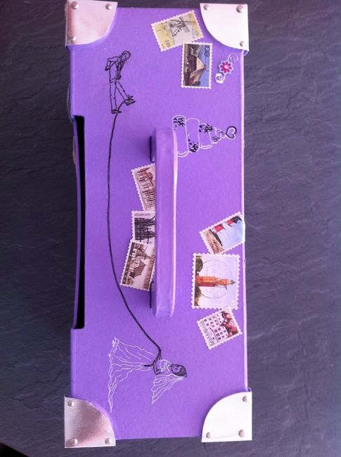 Urne maison dessins de Monsieur, timbre astuce cultura et élément de collage, valise carton brut graffée, rivet et papier argenté, bref un moment à nous et première pierre à notre envie de voyage de noce, soleil, plage, mer, bref nous....! si besoin...