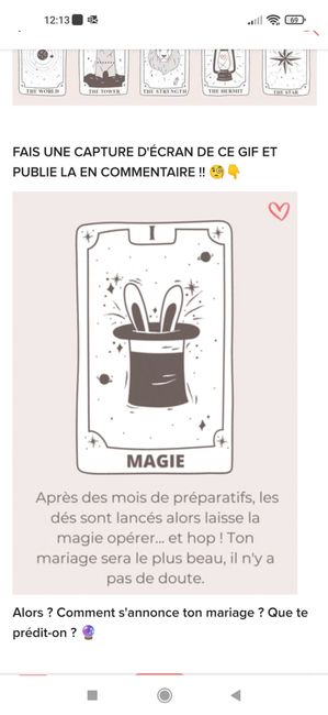 Coucou tout le monde 💜 Merci d'avoir participé jusqu'au bout ! Maintenant qu'on en sait un peu plus sur ton mariage, on va pouvoir tirer les cartes... FAIS UNE CAPTURE D'ÉCRAN DE CE GIF ET PUBLIE LA EN COMMENTAIRE !! 🧐👇 Alors ? Comment s'annonce ton...