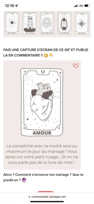 Coucou tout le monde 💜 Merci d'avoir participé jusqu'au bout ! Maintenant qu'on en sait un peu plus sur ton mariage, on va pouvoir tirer les cartes... FAIS UNE CAPTURE D'ÉCRAN DE CE GIF ET PUBLIE LA EN COMMENTAIRE !! 🧐👇 Alors ? Comment s'annonce ton...