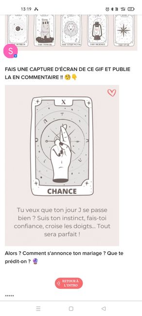 Coucou tout le monde 💜 Merci d'avoir participé jusqu'au bout ! Maintenant qu'on en sait un peu plus sur ton mariage, on va pouvoir tirer les cartes... FAIS UNE CAPTURE D'ÉCRAN DE CE GIF ET PUBLIE LA EN COMMENTAIRE !! 🧐👇 Alors ? Comment s'annonce ton...