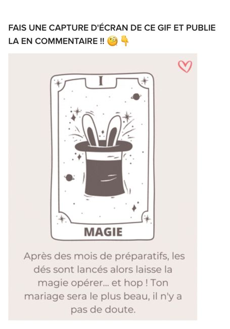 Coucou ✨ On arrive à la fin encore un petit effort car cette étape est très importante ! 👉 Fais un seul voeu pour ton mariage, écris le à la suite dans les commentaires et ensuite passe à la dernière catégorie de ce tirage de carte pour savoir ce que...