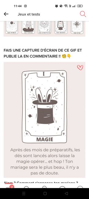 Coucou tout le monde 💜 Merci d'avoir participé jusqu'au bout ! Maintenant qu'on en sait un peu plus sur ton mariage, on va pouvoir tirer les cartes... FAIS UNE CAPTURE D'ÉCRAN DE CE GIF ET PUBLIE LA EN COMMENTAIRE !! 🧐👇 Alors ? Comment s'annonce ton...