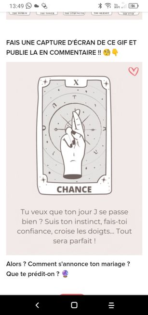 Coucou tout le monde 💜 Merci d'avoir participé jusqu'au bout ! Maintenant qu'on en sait un peu plus sur ton mariage, on va pouvoir tirer les cartes... FAIS UNE CAPTURE D'ÉCRAN DE CE GIF ET PUBLIE LA EN COMMENTAIRE !! 🧐👇 Alors ? Comment s'annonce ton...