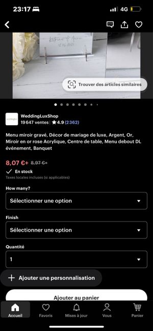 Hello la commu, j ai grandement besoin de vos avis . Qui a déjà commandé sur Etsy. Je voudrais faire mes menus et marques places sur miroir personnalisé mais perso je ne comprends pas du tout comment on commande. Si l une d entre vous peux m aider ça...