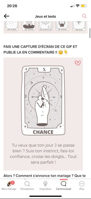 Coucou tout le monde 💜 Merci d'avoir participé jusqu'au bout ! Maintenant qu'on en sait un peu plus sur ton mariage, on va pouvoir tirer les cartes... FAIS UNE CAPTURE D'ÉCRAN DE CE GIF ET PUBLIE LA EN COMMENTAIRE !! 🧐👇 Alors ? Comment s'annonce ton...