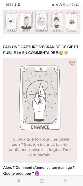 Coucou tout le monde 💜 Merci d'avoir participé jusqu'au bout ! Maintenant qu'on en sait un peu plus sur ton mariage, on va pouvoir tirer les cartes... FAIS UNE CAPTURE D'ÉCRAN DE CE GIF ET PUBLIE LA EN COMMENTAIRE !! 🧐👇 Alors ? Comment s'annonce ton...