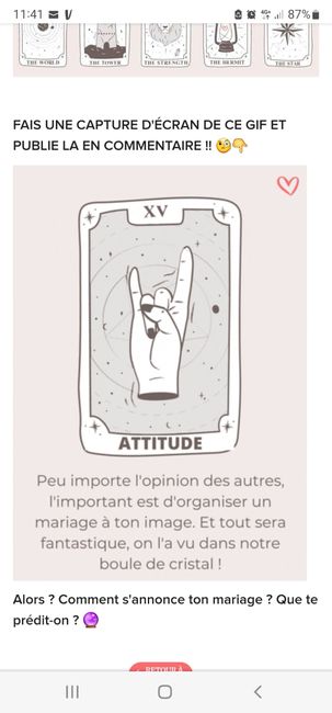 Coucou tout le monde 💜 Merci d'avoir participé jusqu'au bout ! Maintenant qu'on en sait un peu plus sur ton mariage, on va pouvoir tirer les cartes... FAIS UNE CAPTURE D'ÉCRAN DE CE GIF ET PUBLIE LA EN COMMENTAIRE !! 🧐👇 Alors ? Comment s'annonce ton...