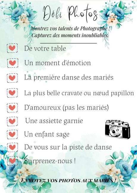 Bonsoir, J'ai vu passer ici une idée d'animation il y a quelques temps : il s'agissait de demander aux invités de réaliser un certain nombre de défis-photos, puis d'envoyer les photos... sur je ne sais plus quelle application. Comme nous aurons un...