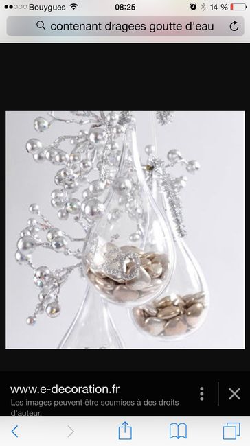 bonjour, Je cherche sans succès la décoration argentées accrochées à ces contenants en goutte d eau. Quelqu'un peut il m aider ? Même le site sur lequel j'ai trouvé la photo ne vend pas la deco qui va avec. Merci les brides