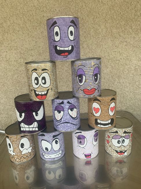 J’ai créé notre chamboule tout pour les enfants (et même les plus grands 🤪) … j ai d’abord rempli mes boites de conserve avec du papier en decopatch ! Dans nos couleurs bien sûr… puis avec des posca je les ai costumiser ! Et voilà… 🥰