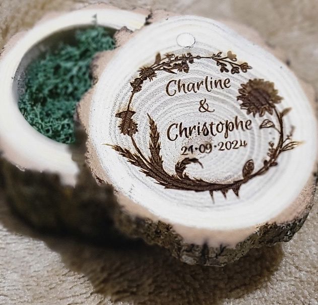 Alors nous avons fait faire notre livre d’or en bois par une société française et notre boîte à alliance … ces deux créations viennent d’un site très célèbre de création artisanale qui commence par un « Et.. » ! Nous sommes super heureux de nos deux...