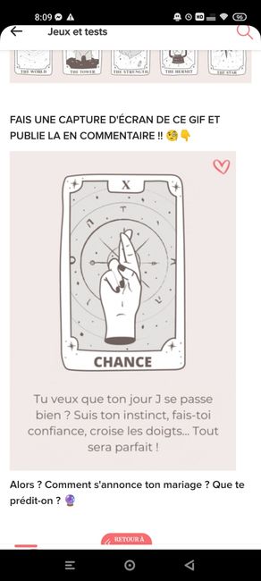 Coucou tout le monde 💜 Merci d'avoir participé jusqu'au bout ! Maintenant qu'on en sait un peu plus sur ton mariage, on va pouvoir tirer les cartes... FAIS UNE CAPTURE D'ÉCRAN DE CE GIF ET PUBLIE LA EN COMMENTAIRE !! 🧐👇 Alors ? Comment s'annonce ton...