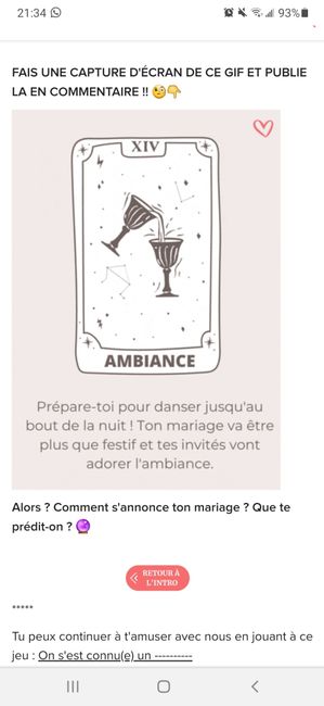 Coucou tout le monde 💜 Merci d'avoir participé jusqu'au bout ! Maintenant qu'on en sait un peu plus sur ton mariage, on va pouvoir tirer les cartes... FAIS UNE CAPTURE D'ÉCRAN DE CE GIF ET PUBLIE LA EN COMMENTAIRE !! 🧐👇 Alors ? Comment s'annonce ton...