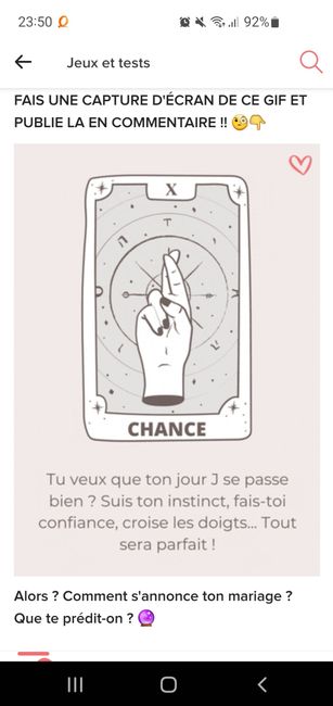 Coucou tout le monde 💜 Merci d'avoir participé jusqu'au bout ! Maintenant qu'on en sait un peu plus sur ton mariage, on va pouvoir tirer les cartes... FAIS UNE CAPTURE D'ÉCRAN DE CE GIF ET PUBLIE LA EN COMMENTAIRE !! 🧐👇 Alors ? Comment s'annonce ton...