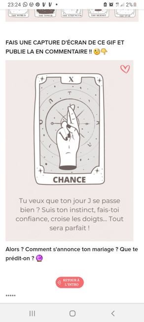 Coucou tout le monde 💜 Merci d'avoir participé jusqu'au bout ! Maintenant qu'on en sait un peu plus sur ton mariage, on va pouvoir tirer les cartes... FAIS UNE CAPTURE D'ÉCRAN DE CE GIF ET PUBLIE LA EN COMMENTAIRE !! 🧐👇 Alors ? Comment s'annonce ton...