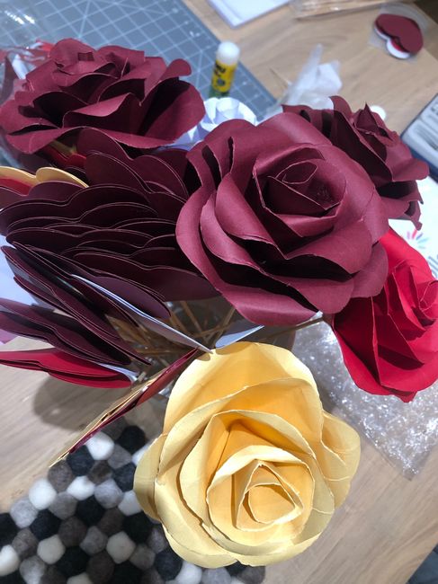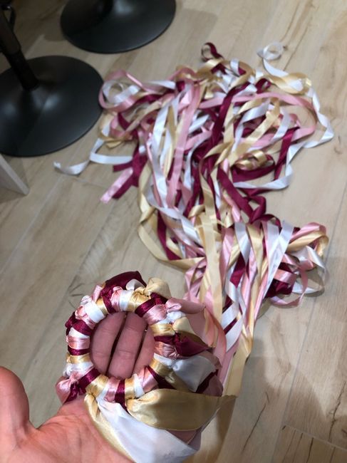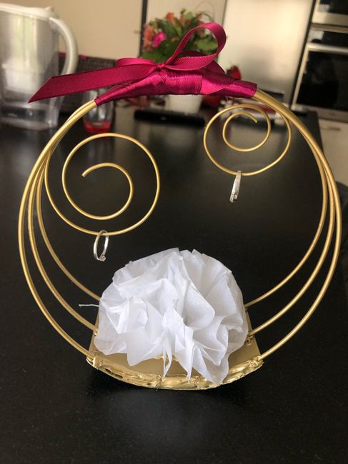 Voici le support pour nos alliances à l’église. La fleur en papier sera remplacée par une composition en fleurs naturelles faite par notre fleuriste.