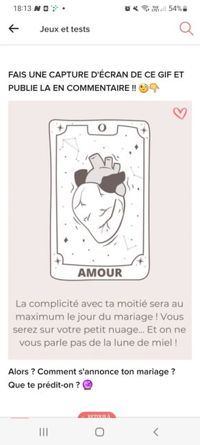 Coucou tout le monde 💜 Merci d'avoir participé jusqu'au bout ! Maintenant qu'on en sait un peu plus sur ton mariage, on va pouvoir tirer les cartes... FAIS UNE CAPTURE D'ÉCRAN DE CE GIF ET PUBLIE LA EN COMMENTAIRE !! 🧐👇 Alors ? Comment s'annonce ton...