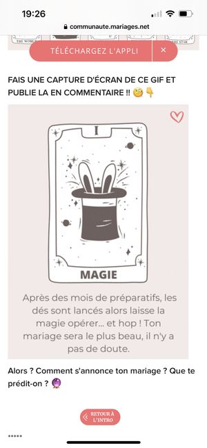 Coucou tout le monde 💜 Merci d'avoir participé jusqu'au bout ! Maintenant qu'on en sait un peu plus sur ton mariage, on va pouvoir tirer les cartes... FAIS UNE CAPTURE D'ÉCRAN DE CE GIF ET PUBLIE LA EN COMMENTAIRE !! 🧐👇 Alors ? Comment s'annonce ton...