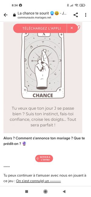 On souhaite voir ton compteur sur Mariages.net ❤️ Tu le partages en commentaire ? Let's gooooo 😎 *** Sur ce jeu on te lit ton avenir nuptial >> Jour de chance : les Admins tirent les cartes de ton mariage 🔮