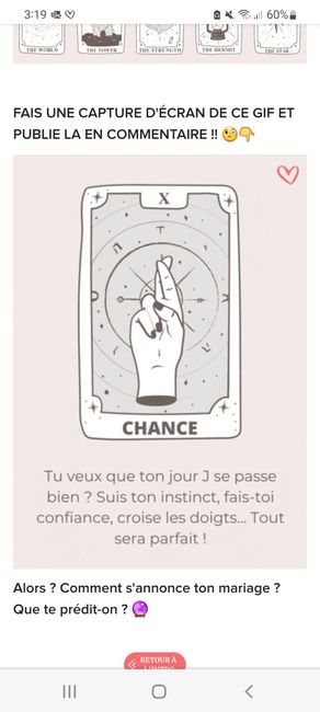 Coucou tout le monde 💜 Merci d'avoir participé jusqu'au bout ! Maintenant qu'on en sait un peu plus sur ton mariage, on va pouvoir tirer les cartes... FAIS UNE CAPTURE D'ÉCRAN DE CE GIF ET PUBLIE LA EN COMMENTAIRE !! 🧐👇 Alors ? Comment s'annonce ton...
