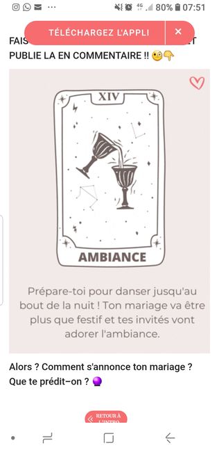 Coucou tout le monde 💜 Merci d'avoir participé jusqu'au bout ! Maintenant qu'on en sait un peu plus sur ton mariage, on va pouvoir tirer les cartes... FAIS UNE CAPTURE D'ÉCRAN DE CE GIF ET PUBLIE LA EN COMMENTAIRE !! 🧐👇 Alors ? Comment s'annonce ton...
