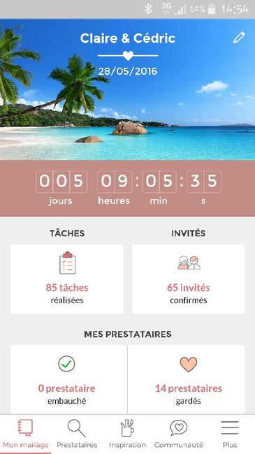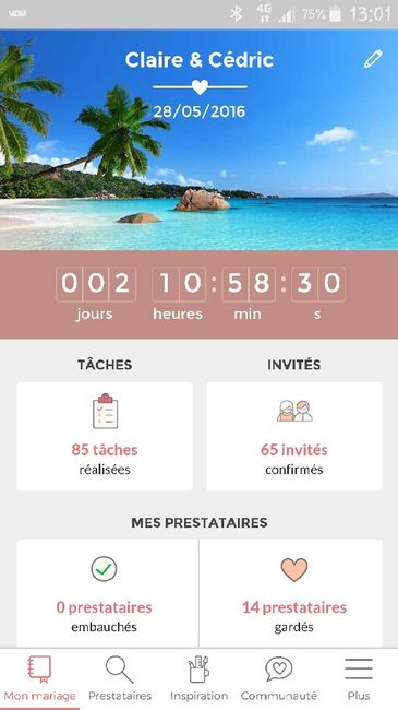 J - 1 mois tout pile pour moi les filles. Encore plusieurs détails non réglés. Tous les invités n'ont pas encore confirmé il en manque 6 en fait lol dernière limite le 1 er juin. Pas de nouvelles de mon traîteur mais il paraît que est normal d'après...