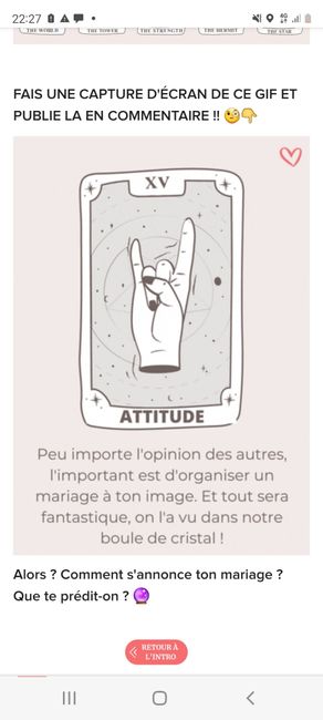 Coucou tout le monde 💜 Merci d'avoir participé jusqu'au bout ! Maintenant qu'on en sait un peu plus sur ton mariage, on va pouvoir tirer les cartes... FAIS UNE CAPTURE D'ÉCRAN DE CE GIF ET PUBLIE LA EN COMMENTAIRE !! 🧐👇 Alors ? Comment s'annonce ton...
