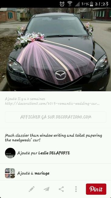 Bonjour, nous on aime pas trop les décorations de voitures classiques avec des noeuds partout. On voudrait quelques chose de discret, seulement des rubans à accrocher je ne sais pas aux antennes aux poignées de portes etc... Est ce que l'une d'entre...