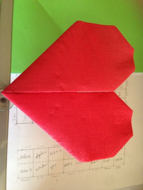 Aujourd'hui essai pliage serviette en papier en forme de cœur finalement fait en 10 seconde très simple cheri aime aussi donc plus qu'à en faire une cinquantaine bien les ranger avec un livre dessus pour pas que sa froisse !