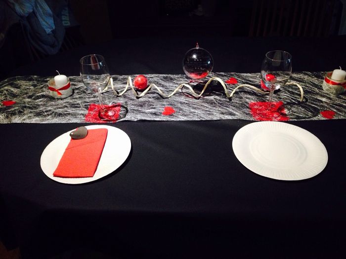 Voilà notre table test il manque des petits choses mais sa donne une bonne idée !la serviette rouge sera en forme de fleur faut qu'on essaye !apres la j'ai oas la jolie vaisselle mais quand pensez vous ?