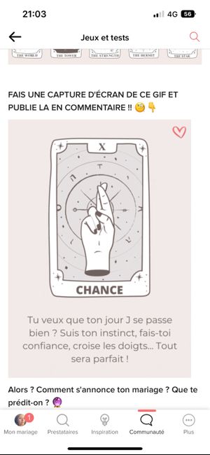 Coucou tout le monde 💜 Merci d'avoir participé jusqu'au bout ! Maintenant qu'on en sait un peu plus sur ton mariage, on va pouvoir tirer les cartes... FAIS UNE CAPTURE D'ÉCRAN DE CE GIF ET PUBLIE LA EN COMMENTAIRE !! 🧐👇 Alors ? Comment s'annonce ton...