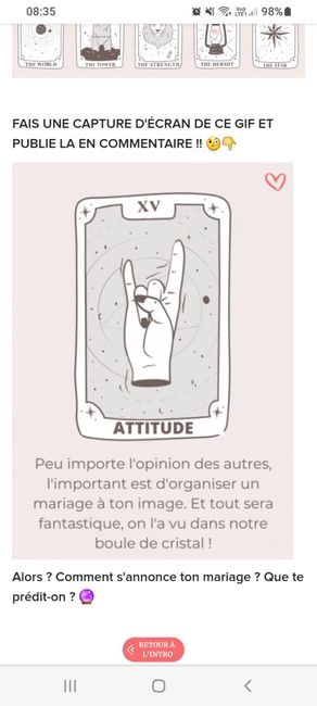 Coucou tout le monde 💜 Merci d'avoir participé jusqu'au bout ! Maintenant qu'on en sait un peu plus sur ton mariage, on va pouvoir tirer les cartes... FAIS UNE CAPTURE D'ÉCRAN DE CE GIF ET PUBLIE LA EN COMMENTAIRE !! 🧐👇 Alors ? Comment s'annonce ton...